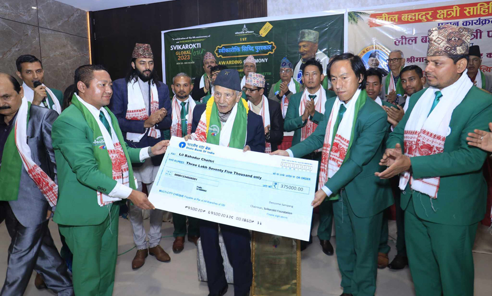 गुवाहाटी, भारत, २७ मंसिर–स्वीकारोक्ति फाउन्डेसनले नेपाली साहित्यका मुर्धन्य व्यक्तित्व लीलबहादुर क्षेत्रीलाई ६ लाख नेपाली नगद राशिसहित स्वीकारोक्ति सिद्धि पुरस्कार हस्तान्तरण गरेको छ ।