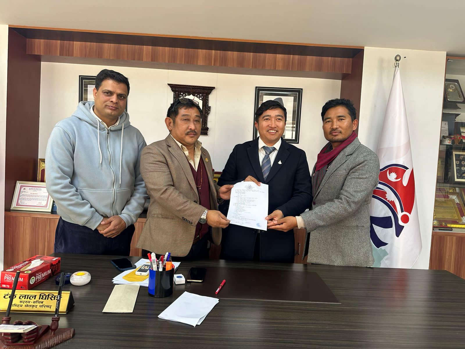 दमक, १६ माघ–झापाको कमल गाउँपालिका ५ गेउरियामा निर्माणाधिन आदिवासी रंगशालाको निर्माणका लागि मंगलवार राष्ट्रिय खेलकुद परिगषद (राखेप) का सदस्य सचिव टंकलाल घिसिङसंग संझौता गर्दें रंगशालाका अध्यक्ष समेत पालिका अध्यक्ष हुकुमसिंह राई ।