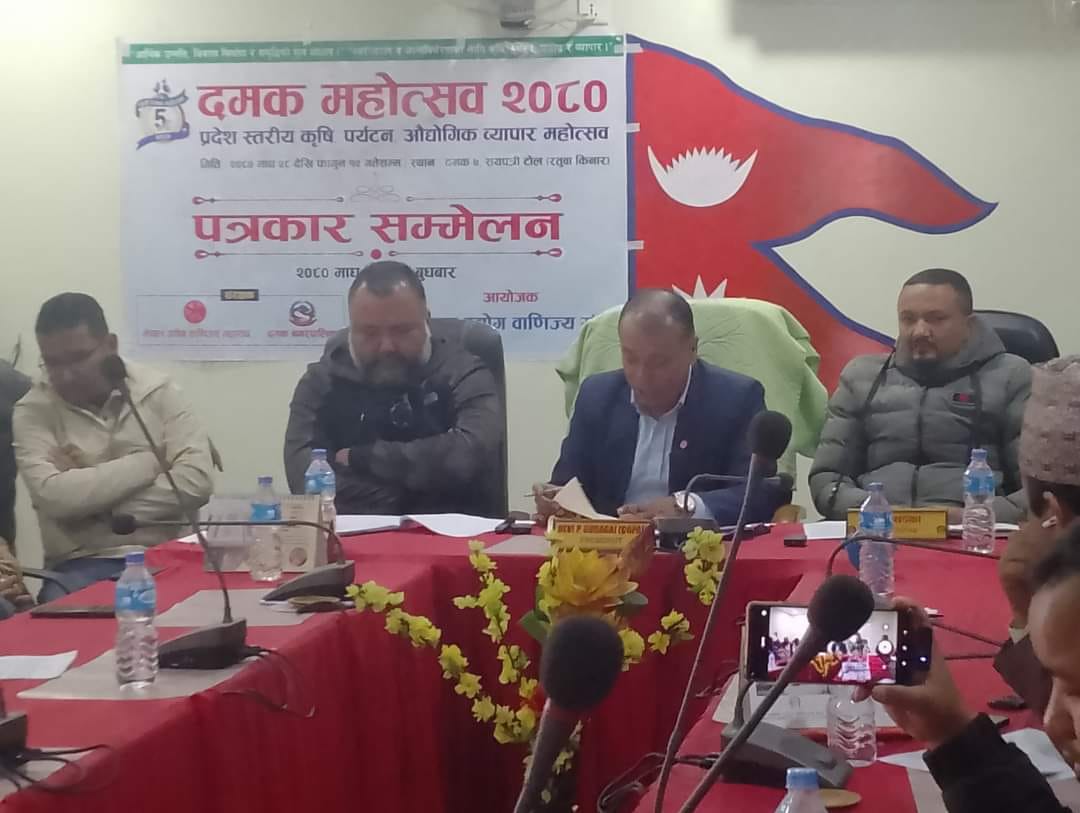 दमक उद्योग बाणिज्य संघले आफ्नो कार्यालयमा पत्रकार सम्मेलन गरेर माघ २८ गतेदेखि फागुन १२ गतेसम्म प्रादेशिक औद्योगिक व्यापार, कृषि एबम् पर्यटन प्रबद्र्धन गर्न दमक महोत्सव सञ्चालन गर्न लागिएको जानकारी गरायो । संघका अध्यक्ष देबि बहादुर (गोपाल) गुरागाईका अनुसार दमक–७ सयपत्री टोलको रतुवा किनारमा महोत्सव सञ्चालन हुने भएको छ । अध्यक्ष गुरागाईले महोत्सवमा रु ५ करोड बराबरको अनुमानित कारोवार हुनुका साथैं एक लाख अवोलकनकर्ताहरुले सहभागिता जनाउने लक्ष्य राखिएको बताए ।