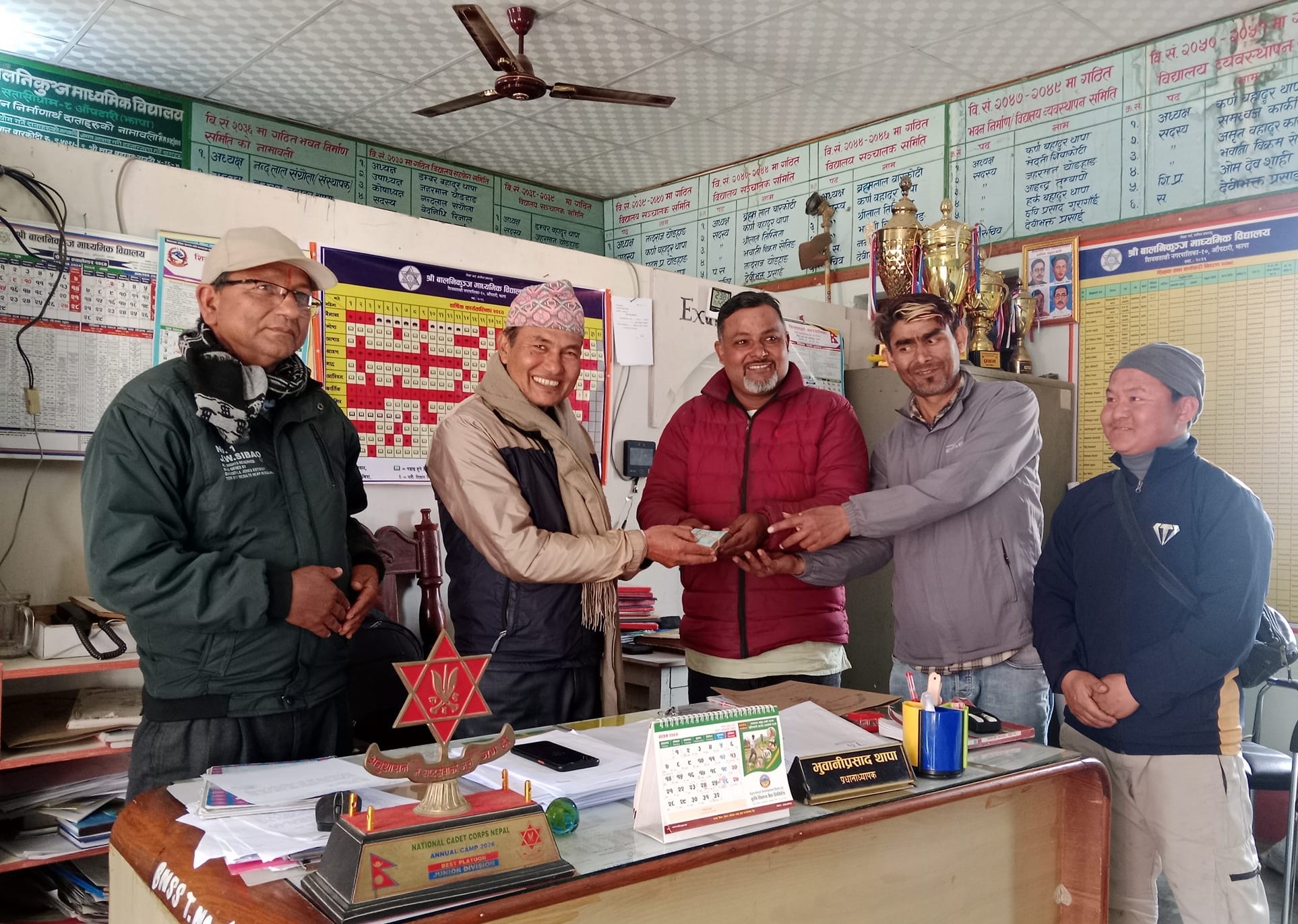 विद्यालयका प्रधानध्यापक भुवानी थापा र सहायक प्रधानध्यापक बिष्णुप्रसाद खतिवडालाई रु १ लाख हस्तान्त्रण गरिएको हो । सो सहयोग रुपैया दोमुखा धार्मीक तथा पर्यटन विकास संस्थाका अध्यक्ष धनप्रसाद लावोती, उपाध्यक्ष चुडामणी (रमेश) तिम्सिना, धार्मीकतर्फ उपाध्यक्ष सुमन संग्रौला, सचिव धनकुमार ढकाल र सहसचिव फणिन्द्र राईको उपस्थिति थियो । अध्यक्ष लावोतीले अनुसार विद्यालयलाई पहिलो किस्ता वापत रु १ लाख उपलब्ध गराइएको र छिट्टै दोस्रो किस्ता वापत रु १ लाख उपलब्ध गराइने बताए ।