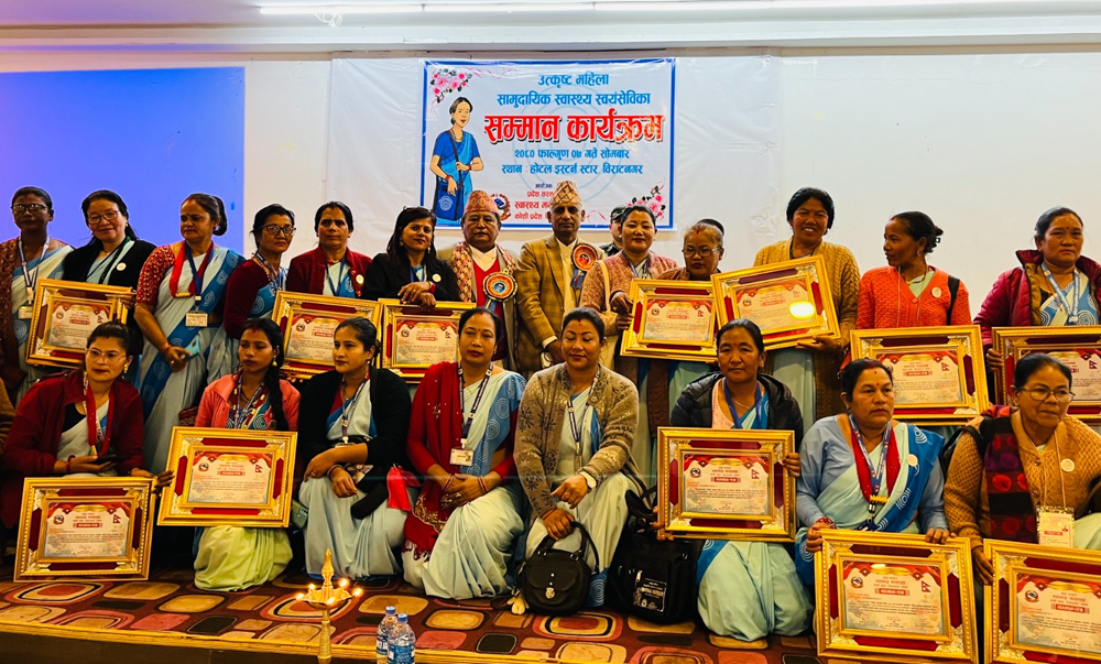 झापा, ८ फागुन–हरेक कार्यक्रममा अतिथि स्टेजमा हुन्छन्, अतिथिका लागि सारसज्जावट छुट्टै हुन्छ । सोमबार प्रजातन्त्र दिवसको अवसरमा विराटनगरमा आयोजित कोशी प्रदेशभरिका स्वास्थ्य महिला स्वयंसेविका सम्मान कार्यक्रमको झलक फरक थियो । स्टेजमा स्वयंसेविका र दर्शक दीर्घामा अतिथि देख्दा कार्यक्रम हलमा पस्ने जो कोहीले फरक अनुभूति गरिरहेका थिए । महिला स्वयंसेविकाहरू सम्मानितहुँदा बखत भक्कानिइरहेका थिए ।