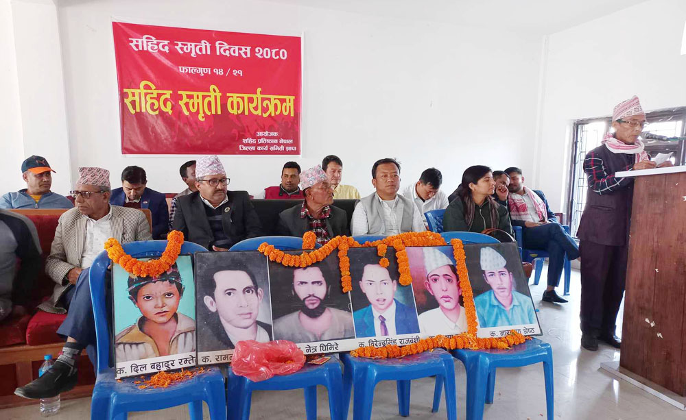 सहिद प्रतिष्ठान नेपाल झापाका अध्यक्ष निर्मल पौडेलको अध्यक्षतामा भएको कार्यक्रममा प्रतिष्ठानका सचिव विरेन्द्र बस्नेतले गर्नुभएको थियो ।