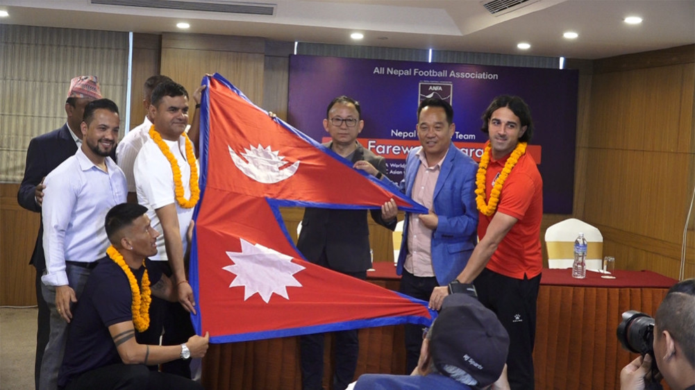 आज (आइतबार) काठमाडौंमा आयोजित एक कार्यक्रमकाबीच एन्फा पदाधिकारीले नेपालको झण्डा हस्तान्तरण गरेर विश्वकप छनोट दोस्रो चरण अन्तर्गत युएई र यमनसँग हुने खेल खेल्नका लागि साउदी अरब जान लागेको टोलीको बिदाइ गरेको हो ।
