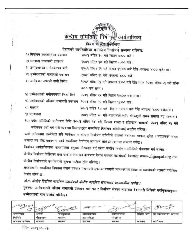 प्रदेश समितिको मनोनयन मङ्सिर २४ गते जिल्ला शाखा र प्रतिष्ठान शाखाको मङ्सिर २६ गते मनोनयन दर्ता गर्ने गरी व्यवस्था मिलाउनुहुन सम्बन्धित निर्वाचन समितिलाई अनुरोध समेत गरिएको छ ।