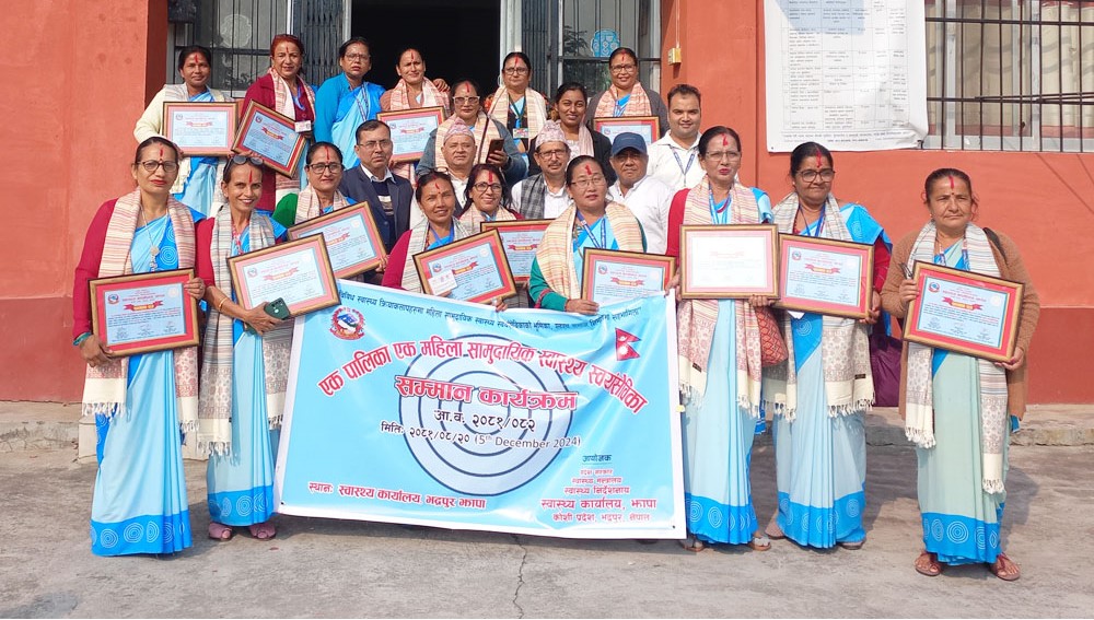 कोशी प्रदेश सरकारको ‘एक पालिका, एक महिला सामुदायिक स्वास्थ्य स्वयम्सेविका सम्मान कार्यक्रम’ अन्तरगत स्वास्थ्य कार्यालय झापाले १५ वटा पालिकाका १५ जना स्वास्थ्य स्वयम्सेविकाहरुलाई जनही १२ हजार रुपैयाँसहित सम्मान–पत्र प्रदान गरिएको छ ।