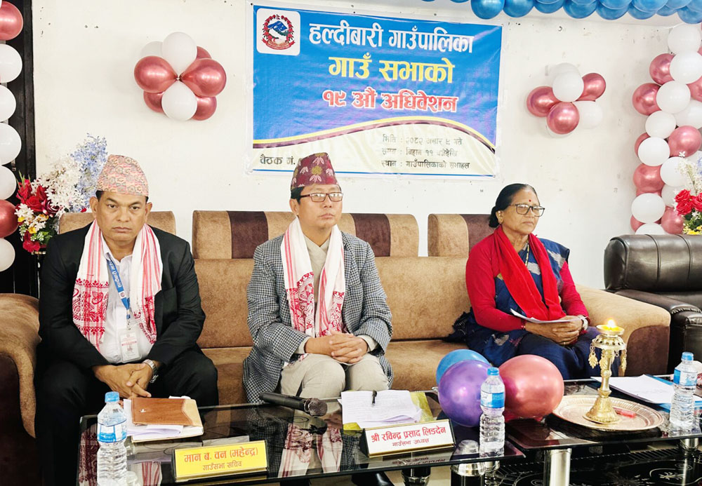 हल्दिबारी गाउँपालिका गाउँ सभा अध्यक्ष रविन्द्र प्रसाद लिङ्देनको अध्यक्षतामा भएको कार्यक्रममा सबै जनप्रतिनिधिहरु र कर्मचारीहरुको उपस्थिति रहेको थियो। सभामा हल्दीबारी वडा नं ४ का वडा सचिव जयप्रसाद पोखरेल र हल्दीबारी स्वास्थ्य चौकीका प्रमुख रामप्रसाद ढकाललाई दिर्घसेवा सम्मानबाट सम्मानित गरिएको थियो दुवैजना आगामी साउनबाट अवकास पाउन लागेका छन् । बजेट तथा कार्यक्रम पालिकाका प्रवक्ता देवीबहादुर थापाले प्रस्तुत गरेका थिए ।