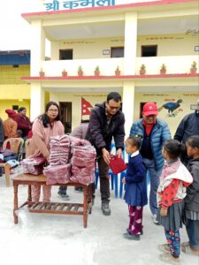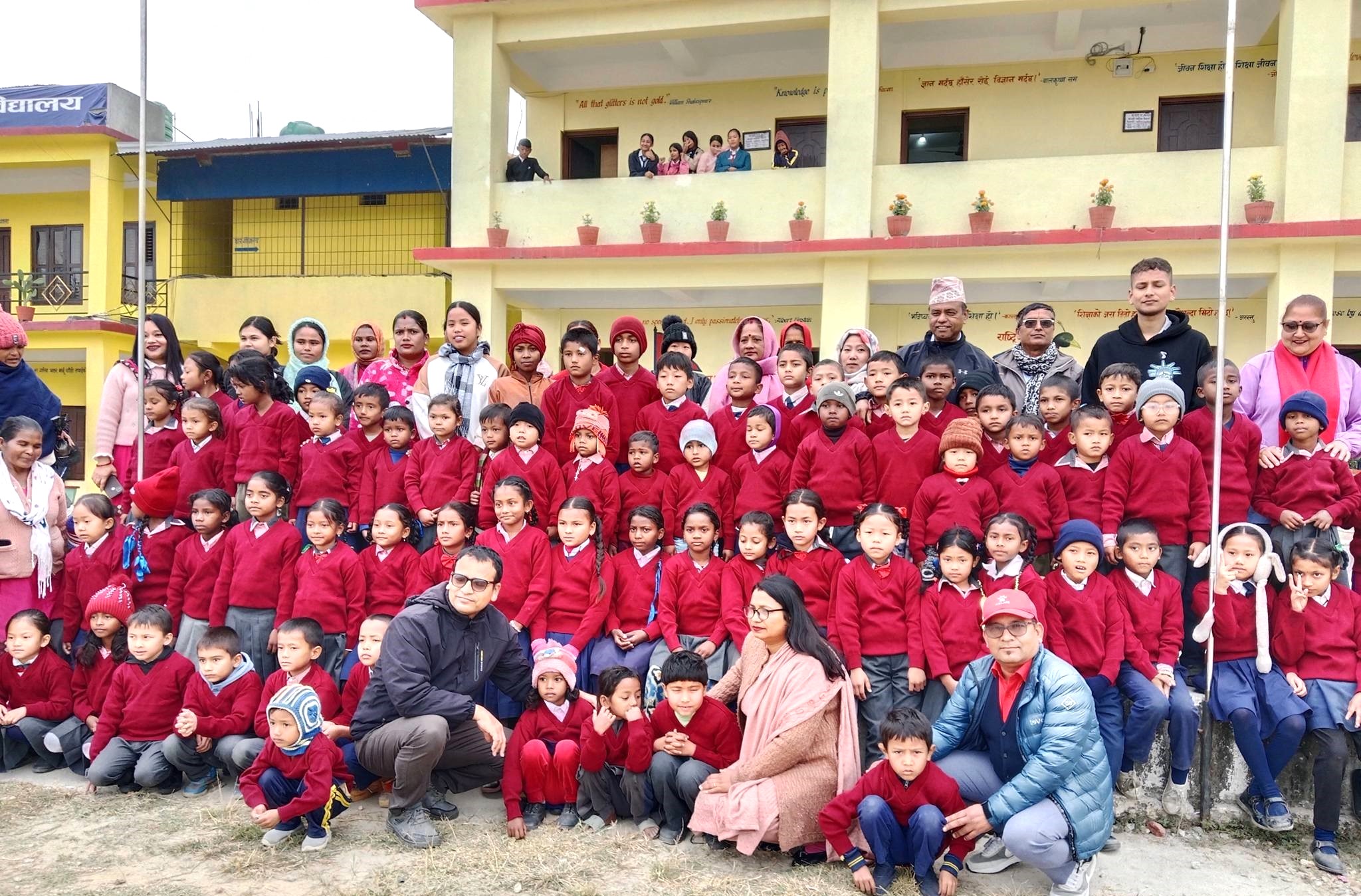 जीवन बिताइरहेका बन्धुकमार निरौलाले आज आफुले बाल्यकालमा अध्ययन गरेर सोही विद्यालयमा अध्यापनसमेत गरेका विद्यालयका कक्षा–१ देखि ३ सम्मका ९३ जना विद्यार्थीहरुलाई न्यानो कपाडा वितरण गरेका हुन् ।