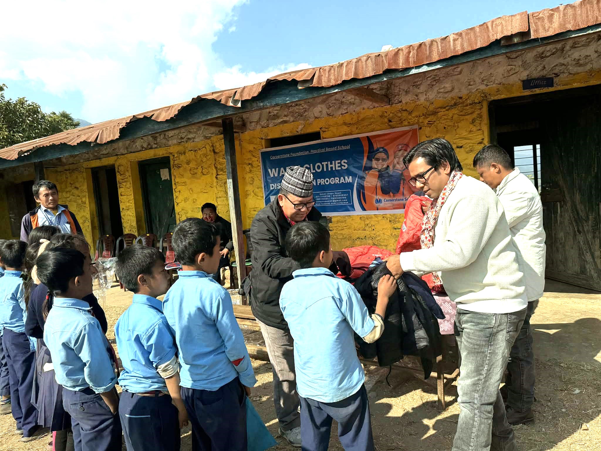 विद्यालयमा अध्ययनरत २ वर्षदेखि १३ वर्षसम्मका ८० जना विद्यार्थीहरुलाई न्यानो कपडा वितरण गरिएको कर्नरस्टोन फाउण्डेशन स्कुलका संस्थापक प्रिन्सिपल गजमेरले जानकारी गराउनुभयो ।
