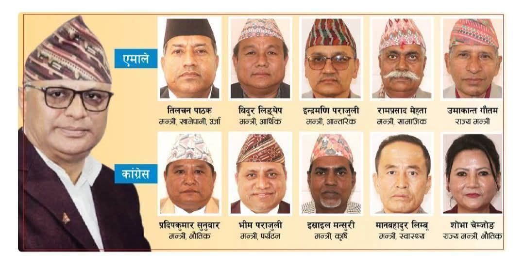 पुनर्गठित मन्त्रिमण्डलमा भौतिक पूर्वाधार विकास मन्त्री प्रदीपकुमार सुनुवार, पर्यटन, वन तथा वातावरण मन्त्री भिम पराजुली, खानेपानी, सिचाई तथा उर्जामन्त्री तिलचन पाठक, आन्तरिक मामिला तथा कानुनमन्त्री इन्द्र मणी पराजुली, आर्थिक मामिला तथा योजना मन्त्री विदुर कुमार लिंथेप, सामाजिक विकासमन्त्री रामप्रसाद महतो, स्वास्थ्यमन्त्री मान बहादुर लिम्बु र उद्योग, कृषि तथा सहकारी मन्त्रीमा इस्राईल मन्सुरी रहनु भएको छ ।