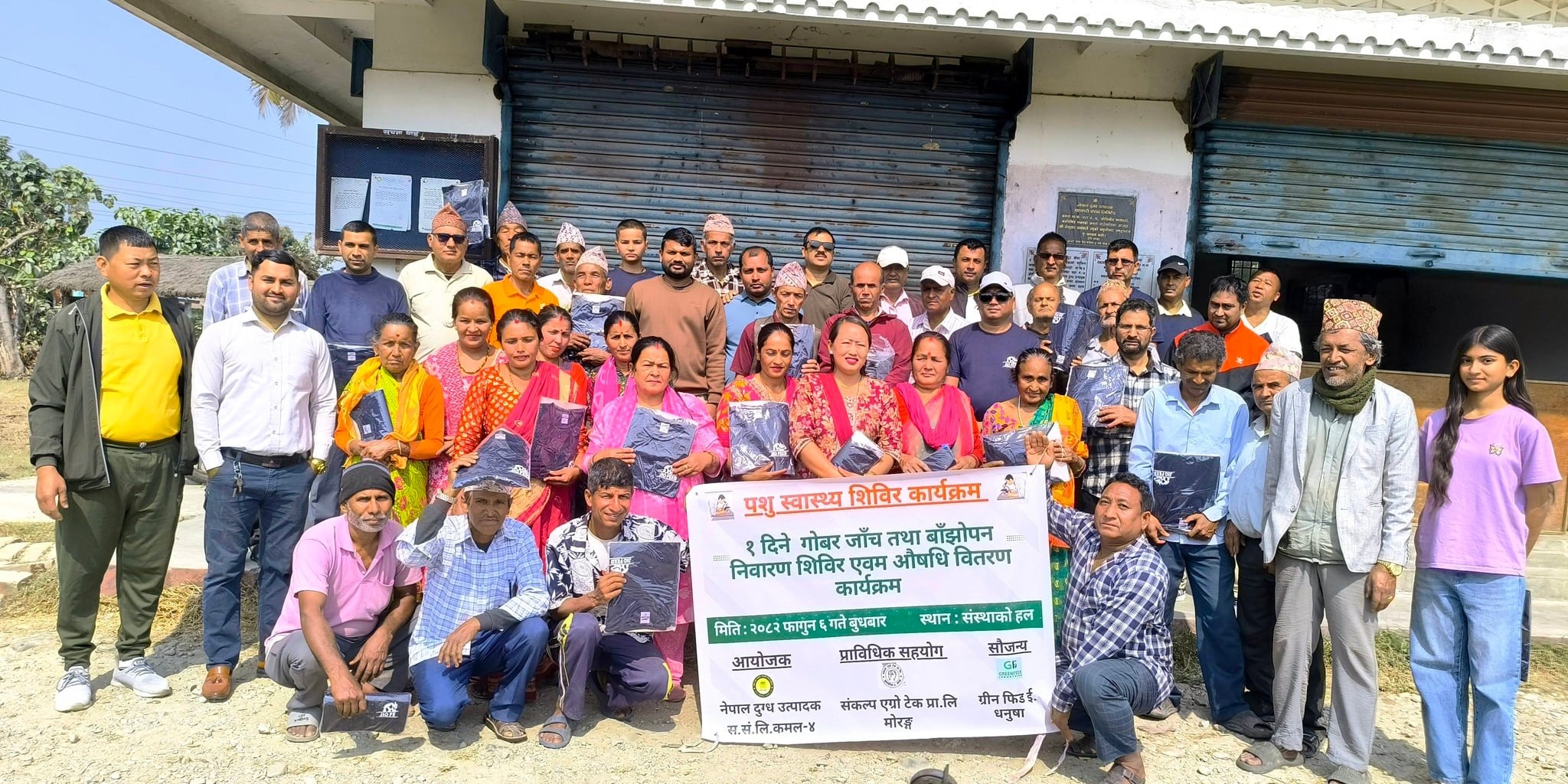 नेपाल दुग्ध उत्पादक सहकारी संस्था लिमिटेड, कमल–४ को आयोजना, संकल्प एग्रो टेक प्रा.लि. मोरङको प्राविधिक सहयोग तथा ग्रीन फीड्स इन्डष्ट्रिज प्रा.लि.धनुषाको सौजन्यमा बुधबार संस्थाको सभाहलमा आयोजित निःशुल्क पशु स्वास्थ्य शिविर कार्यक्रम सम्पन्न भएको छ ।